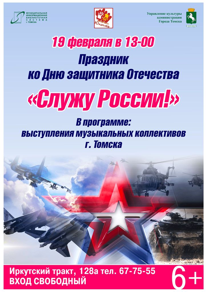 19 февраля в 13.00 в муниципальной библиотеке «Юность» (Иркутский тракт, 128а) пройдёт праздник «Служу России!», приуроченный ко Дню защитника Отечества. Гостей ждёт насыщенная программа от мастеров художественного слова и музыкальных коллективов Томска.Армейская жизнь многогранна и полна событий. За несколько веков сложилось особое направление литературы - военная поэзия и проза. Участники праздника познакомятся с примерами героизма, мужества и стойкости в художественных произведениях российских авторов, а юмористические страницы дополнят картину солдатского быта. 12.02.2026 г.