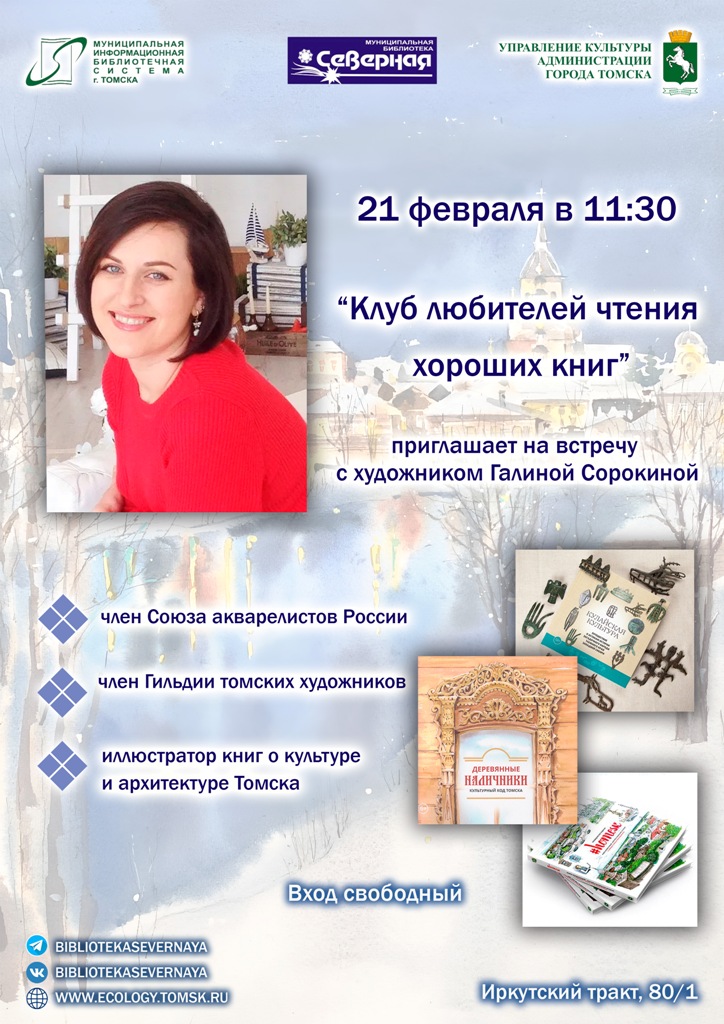 21 февраля в 11.30 муниципальная библиотека «Северная» (Иркутский тракт, 80/1) приглашает всех желающих на заседание Клуба любителей чтения хороших книг, гостем которого станет Г. Сорокина - художник-акварелист, член Союза акварелистов России, член Гильдии томских художников, магистр культурологии.Галина Сорокина проиллюстрировала четыре книги: об истории Томска, о деревянных наличниках, о Кулайской культуре и о народах Томской области. Спикер расскажет о работе над книгами и поделится творческими планами. Участники клуба и гости встречи смогут поближе познакомиться с техникой рисования скетчей, подержат в руках основные инструменты скетчера, а также зададут интересующие их вопросы, подпишут открытки, выполненные талантливой рукой художника. Вход свободный. 13.02.2026 г.