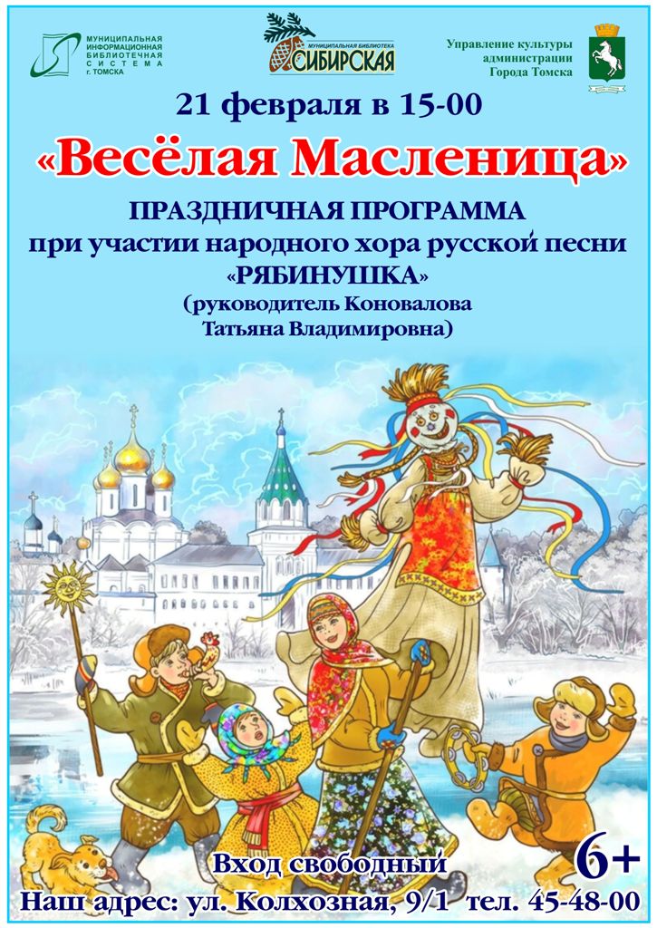 21 февраля в 15.00 муниципальная библиотека «Сибирская» (ул. Колхозная, 9/1) приглашает всех желающих на праздничную программу «Веселая Масленица». Гости познакомятся с традициями праздника, поучаствуют в марафоне частушек и вспомнят народные игры, а приглашенный вокальный коллектив исполнит традиционные песни.С давних времён в народном сознании Масленица означает переход от зимы к весне. Праздник окружён множеством поверий, обычаев и обрядов, которые передаются из поколения в поколение. Участников программы ждёт путешествие к истокам Масленицы, а также встреча с самыми яркими образами русской культуры. Старинные игры, конкурсы и фольклорные мотивы помогут понять и осмыслить народные традиции, приобщиться к историческому наследию родной страны. В продолжение праздника для гостей выступит народный хор русской песни «Рябинушка» под руководством Т. В. Коноваловой. Вход свободный. 13.02.2026 г.