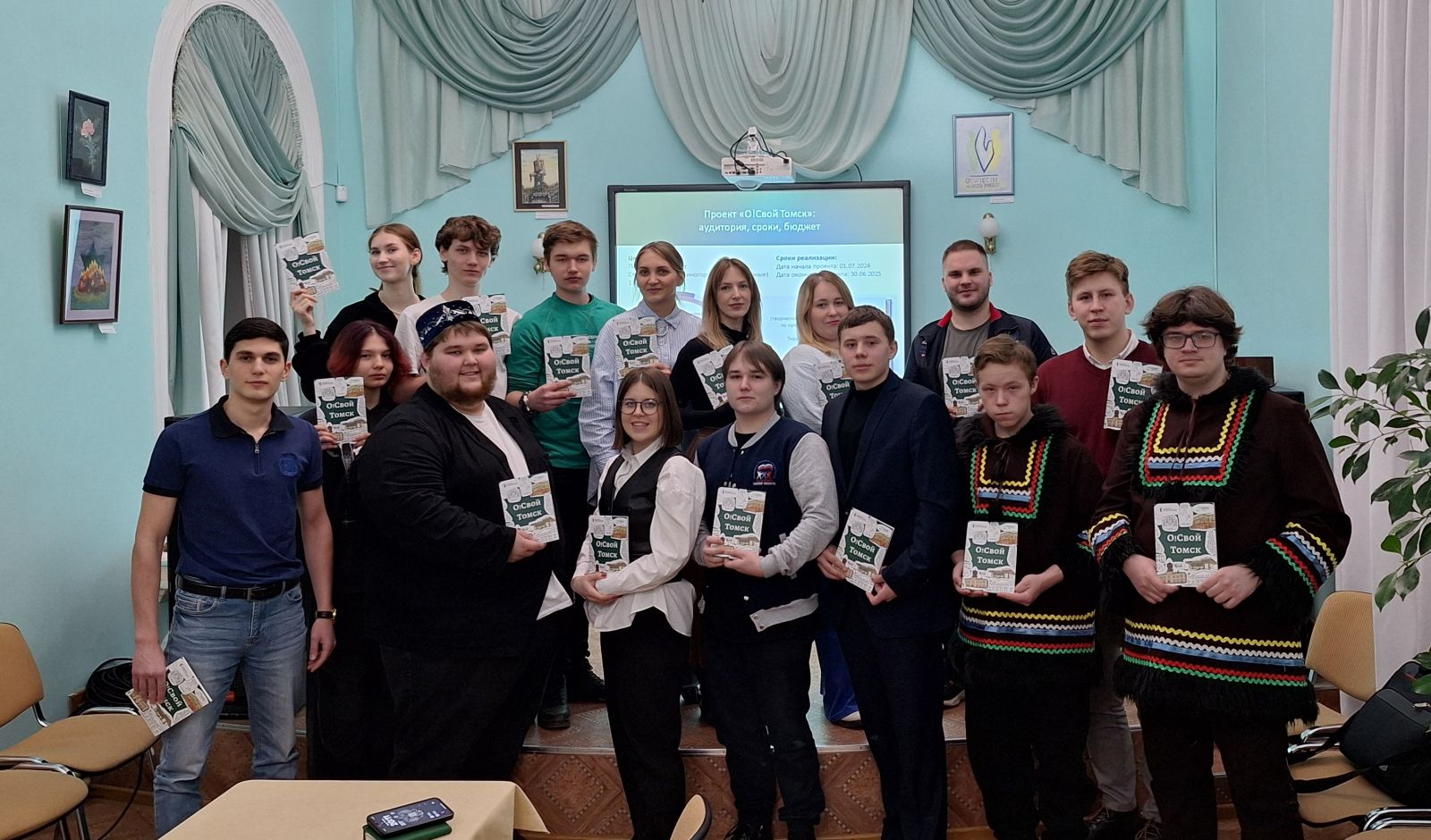 Легендарная команда весёлых и находчивых, созданная на базе Томского государственного университета в марте 2000 года, всегда славилась искромётным юмором и сильной актерской игрой. И даже 25 лет спустя «Максимум» собирает полные залы поклонников всех возрастов и радует своими шутками о Томске, которые стали частью культурного кода региона. На юбилейном концерте команда «Максимум» представила зрителям яркие новые номера и хиты своего творчества, подарила землякам массу положительных эмоций. В качестве ответного подарка ребятам были вручены творческие дневники путешественника по культурным местам города «О!Свой Томск» на память о малой родине – городе юности, студенчества и творческой молодёжи. 19 марта в Центра татарской культуры города Томска состоялось собрание Молодёжной Ассамблееи народов России МЫ-РОССИЯНЕ, которое стало площадкой диалога и новых идей. Целью общения представителей разных организаций за круглым стали укрепление межнационального единства и поддержка молодежным инициативам. Среди обсуждаемых на встрече проектов вниманию участников был представлен дневник путешественника по культурным местам города «О!Свой Томск», который станет важным инструментом для реализации креативных идей и сохранения уникального культурного наследия нашего города. Новости о работе над проектом «О!Свой Томск». 2024 год Презентация проекта «О!Свой Томск» на юбилее Томска7 сентября Томск отметил своё 420-летие! В городе на разных локациях работали несколько площадок, одну из которых представила Муниципальная информационная библиотечная система. Для томичей было организовано пространство игр «Время читать! Время играть!» с развлечениями для детей и взрослых, а также в рамках работы площадки городских библиотек состоялась презентация краеведческого проекта «О!Свой Томск», посвящённого родному городу, который получил поддержку Президентского фонда культурных инициатив. На сцене площадки городских библиотек томичи и гости города впервые познакомились с концепцией творческого дневника путешественника по культурным местам города «О!Свой Томск», задавали интересующие вопросы о проекте. А на информационном стенде «О!Свой Томск» можно было ознакомиться с эскизами будущего краеведческого издания, работа над которым ведётся в настоящее время. Презентация библиотечных проектов в новой модельной библиотеке «Сказка»26 сентября в модельной библиотеке «Сказка» (ул. Косарева, 25) прошло совещание заведующих муниципальных библиотек г. Томска с презентаций библиотечных проектов 2024 года. Вниманию коллег был представлен проект по созданию творческого дневника путешественника по культурным местам города «О!Свой Томск» - победителя Второго грантового конкурса 2024 Президентского фонда культурных инициатив. Автор и руководитель проекта, заведующий сектором информации и деловых связей, и.о. заведующего отделом развития МАУ «МИБС» Л. Опара рассказала коллегам об участии в грантовом конкурсе, об идее создания творческого дневника для подростков и молодёжи, о заданиях, посвящённых истории, культуре и традициям родного города. Это краеведческое издание будет выпущено на средства Президентского фонда культурных инициатив, оно приобщит томскую молодёжь к культурному офлайн-досугу и объединит томские учреждения культуры в культур