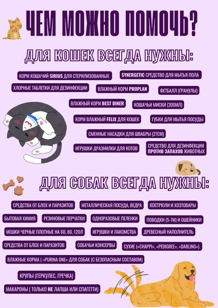 ![]() Сделать доброе дело и подарить шанс на новую жизнь тем, кто ждет поддержки, очень просто - достаточно принести в пункты сбора вещи в хорошем состоянии или корм с действующим сроком годности. Чем можно помочь? - Корм для собак и кошек; - Игрушки и аксессуары; - Игрушки дразнилки для котов; - Наполнители для туалетов и моющие средства; - Собачьи поводки 5-7 м.; - И многое другое (полный список прилагается). Собранная помощь будет отправлена в приют для собак «Дог Хаус» и котокафе «CatSpace». 01.10.2025 г.