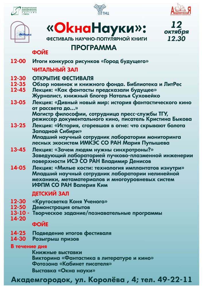![]() Для взрослых посетителей пройдут лекции приглашенных гостей: книжного блогера Н. Суховейко, популяризатора науки К. Быковой, научных сотрудников М. Пупышевой, В. Денисова и В. Ким, а также обзор книжного фонда научно-популярной литературы библиотеки и викторина о фантастических вселенных. Дети смогут пройти интересные задания, поучаствовать в научных опытах и совместном творческом проекте. Для всех участников будет доступна фотозона «Кабинет писателя» и выставка «Окна науки». Также в рамках фестиваля запланированы: подведение итогов конкурса детских рисунков «Город будущего» и розыгрыш призов среди участников. Программа фестиваля. 02.10.2025 г.
