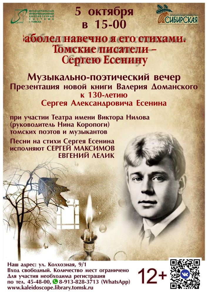 ![]() Гости получат возможность заново открыть для себя силу есенинского гения. В программе запланировано художественное чтение самых ярких и проникновенных произведений, посвященных любви. На вечере прозвучат стихи, раскрывающие всю палитру чувств поэта: от ранних, полных юношеского восторга, до поздних, пронизанных горечью разочарований. Музыкальное сопровождение добавит особую атмосферу. Романсы и песни на стихи С. А. Есенина в исполнении барда С. Васильева позволят прочувствовать каждое слово, каждую эмоцию, заложенную в его поэзии. Мелодии, рожденные из есенинских строк, усилят впечатление от услышанного и помогут глубже проникнуть в мир поэта. Библиотека приглашает всех, кто ценит русскую поэзию, кто хочет ощутить мощь и противоречивость есенинских строк, которые и сегодня говорят с читателем на языке вечной любви. 29.09.2025 г.
