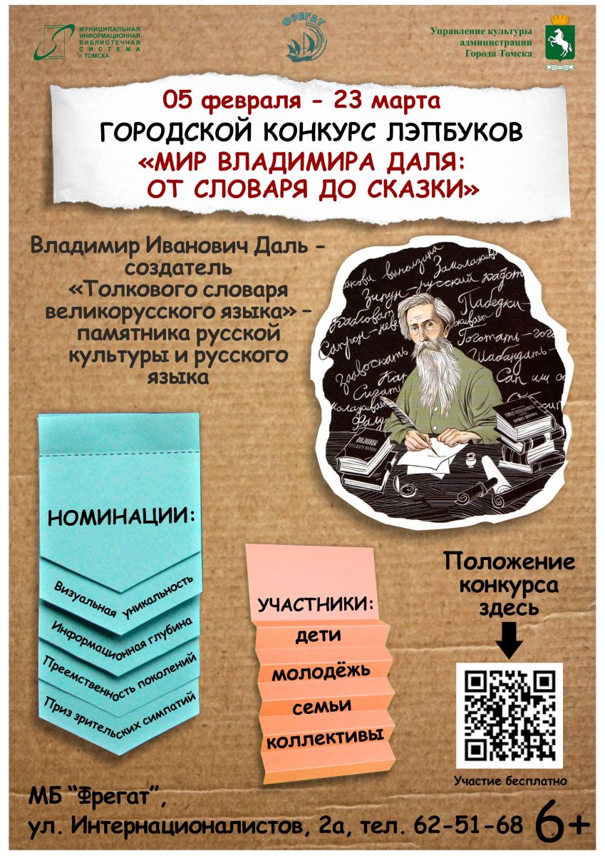 5 февраля стартовал городской конкурс лэпбуков «Мир Владимира Даля: от словаря до сказки», посвящённый 225-летию знаменитого русского писателя, этнографа, лексикографа и фольклориста. Конкурс, который познакомит участников с русской культурой и богатством родного языка, организован Муниципальной информационной библиотечной системой Города Томска и муниципальной библиотекой «Фрегат» (ул. Интернационалистов, 2а).Имя Владимира Ивановича Даля известно, пожалуй, каждому, ведь этот выдающийся человек внёс фундаментальный вклад в русскую культуру. Он был собирателем фольклора, исследователем истории, языков, литературы, культуры, этнографии и религии, был одним из учредителей Русского географического общества, пионером российской гомеопатии, представителем «натуральной школы» в русской литературе и автором записок о последних часах жизни Александра Пушкина. Но самое главное его наследие – это «Толковый словарь живого великорусского языка», включающий более 200 000 слов, на составление которого ушло 53 года. 02.02.2026 г.