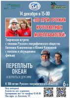 14 декабря в 15.00 в муниципальной библиотеке «Сибирская» (ул. Колхозная, 9/1) пройдёт творческая встреча с членами Русского географического общества Е. Ковалевским и Ю. Калюжной. Организаторы кругосветной экспедиции «По пути русских кругосветных мореплавателей» расскажут о памятных моментах путешествия и представят документальный фильм «Переплыть океан. И вернуться другими».Гостей библиотеки ждёт знакомство с руководителем экспедиции «По пути русских кругосветных мореплавателей» (Russian Ocean Way) Е. Ковалевским и главой Берегового штаба Ю. Калюжной. Без предварительной записи посадочные места не гарантируются! 05.12.2025 г.