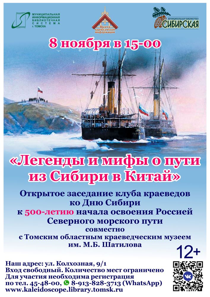 8 ноября в 15.00 в муниципальной библиотеке «Сибирская» (ул. Колхозная, 9/1) пройдёт заседание клуба «Сибирский краевед» на тему «Легенды и мифы о пути из Сибири в Китай». В год 500-летия с начала российского освоения Северного морского пути специальный гость встречи - М. Г. Лоскутова, сотрудник Томского областного краеведческого музея имени М. Б. Шатилова, расскажет гостям об открытии главного морского маршрута и участии Томска в освоении северных территорий.Сотрудники Центра краеведческой информации расскажут о краеведческих отраслевых и художественных изданиях, посвящённых данной теме. Количество мест ограничено. Для участия необходима регистрация по телефону 45-48-00 или 8-913-828-37-13 (WhatsApp) в часы работы библиотеки: вторник – воскресенье с 9.00 до 20.00. Без предварительной записи посадочные места не гарантируются! 01.11.2025 г.