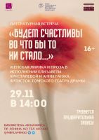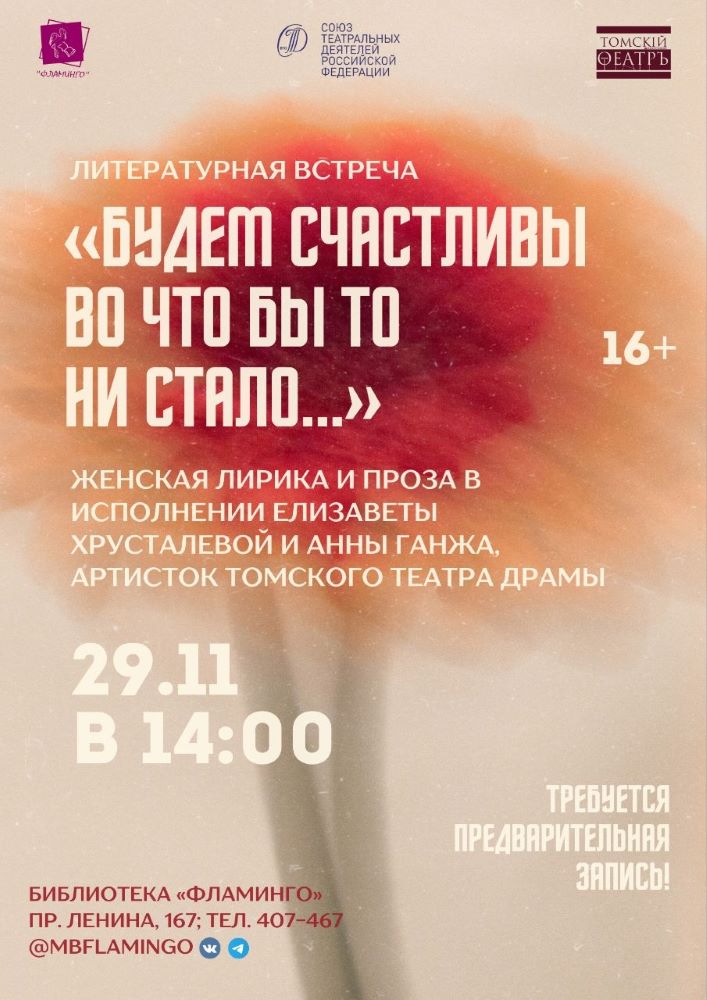 29 ноября в 14.00 муниципальная библиотека «Фламинго» (пр. Ленина, 167) приглашает на литературную встречу «Будем счастливы во что бы то ни стало...» при участии Е. Хрусталёвой и А. Ганжа, артистов Томского театра драмы. Темой вечера станет женская судьба, которая раскроется через лирические произведения и прозу великих авторов.В программе вечера - художественное чтение литературных текстов и поэтические этюды, которые расскажут о любви, судьбе, внутренней силе и загадках женской души. Артисты Томского театра драмы представят лирические зарисовки по мотивам творчества писателей-женщин, которое отличается особой эмоциональностью и глубиной. Популярные и малоизвестные сочинения в исполнении Е. Хрусталёвой и А. Ганжа заиграют новыми оттенками чувств и оставят неизгладимое впечатление от встречи с искусством. Вход свободный. Предварительная запись по телефону 8 (3822) 407-467 или на страницах социальных сетей библиотеки «Фламинго»: Вконтакте, Telegram. 25.11.2025 г.