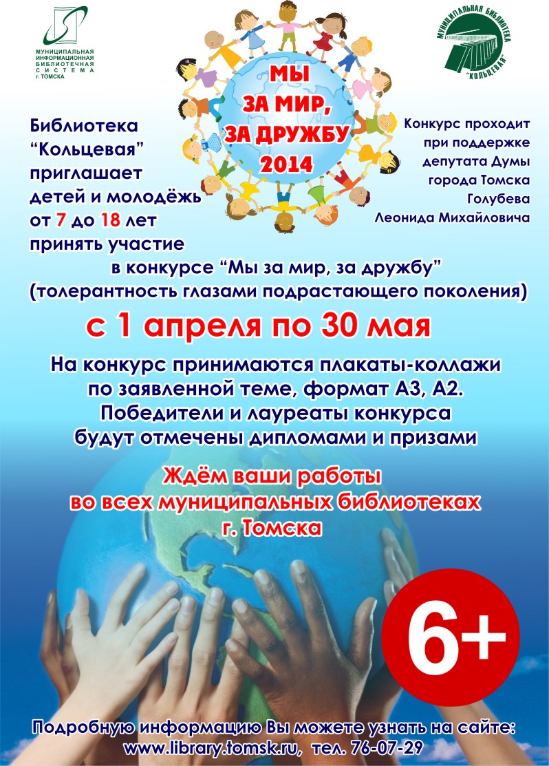 В апреле в муниципальной библиотеке «Кольцевая» стартовал городской конкурс плакатов-коллажей «Мы за мир, за дружбу». Главная задача конкурса – привлечение внимания общественности к проблемам толерантности. Организаторами конкурса выступают Муниципальная информационная библиотечная система, муниципальная библиотека «Кольцевая» при поддержке депутата Думы города Томска Л.М. Голубева.К участию в конкурсе приглашаются дети и молодежь в возрасте от 7 до 18 лет. Работы должны быть выполнены на листе формата А-3 или на большом плакате А-2. Наличие слогана на плакате будет дополнительным преимуществом. Обязательное условие – плакаты-коллажи не должны изображать агрессию и действия экстремистской направленности, а участнику необходимо являться читателем одной из муниципальных библиотек города. В плакатах может быть отражено ненасильственное разрешение конфликтов, на основе взаимного уважения к представителям других национальностей, религиозных конфессий, социальных групп и т.д. Участники, ставшие победителями и лауреатами, приглашаются на церемонию награждения. Работы на конкурс принимаются до 30 мая включительно во всех муниципальных библиотеках города. ПОЛОЖЕНИЕ