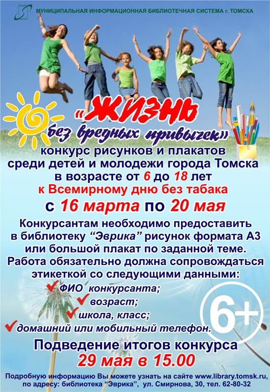 Конкурсные работы будет оценивать компетентное жюри, в составе которого – главный специалист отдела образовательной, просветительной, культурно-досуговой деятельности управления культуры администрации Города Томска Кашинская О.Е.; главный специалист-эксперт отделения межведомственного взаимодействия в сфере профилактики Управления ФСКН России по ТО Зенковская С.В.; главный врач МБЛПУ ЗОТ «Центр медицинской профилактики» Линок Е.А.; педагог изобразительного искусства МАОУ гимназии №56, педагог изостудии «Цветной мир» Думлер Т.П. и др. Победители и лауреаты будут отмечены дипломами и призами. Участники, ставшие победителями и лауреатами, будут приглашены на церемонию награждения. Работы участников будут представлены в библиотеке «Эврика» с 25 мая по 31 августа. |
