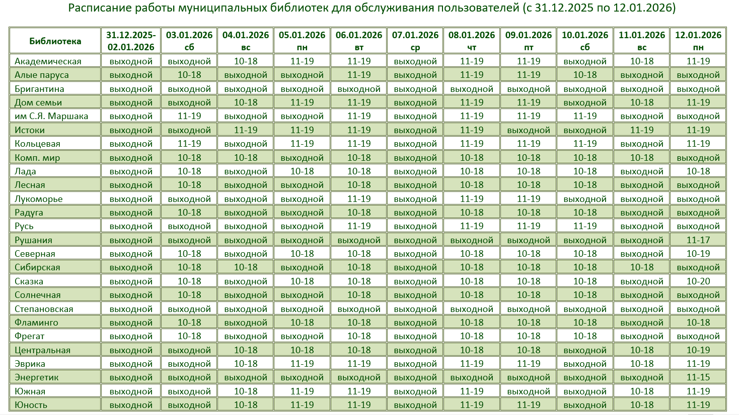 ![]() Уважаемые читатели! В праздничные новогодние дни меняется режим работы наших библиотек. Ознакомиться с изменениями можно здесь. 05.01.2026 г.