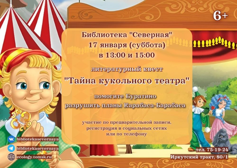 17 января в 13-00 и 15.00 в муниципальной библиотеке «Северная» (Иркутский тракт, 80/1) для юных читателей пройдёт литературный квест «Тайна кукольного театра» по мотивам сказки А. Н. Толстого «Золотой ключик, или Приключения Буратино». В поисках ключа к волшебной дверце участникам предстоит встретиться с персонажами книги, выполнить задания и победить главного злодея. В честь 90-летнего юбилея знаменитой повести-сказки А. Н. Толстого ребята вспомнят сюжет и героев истории о Буратино в ходе увлекательного путешествия по отделам библиотеки. Ребята разгадают множество головоломок, спасут кукольный театр, найдут Золотой ключик и разрушат планы Карабаса Барабаса. Победители получат символический приз — золотой ключик, символизирующий завершение путешествия и открытие дверей в мир фантазии и творчества. Квест подарит массу положительных эмоций и укрепит любовь к чтению, позволяя каждому почувствовать себя участником захватывающего приключения, начатого почти век назад великим русским писателем А. Н. Толстым. Вход свободный! Предварительная регистрация в детском отделе библиотеки, по телефону 8 (3822) 75-19-24, либо по ссылкам ниже: 08.01.2026 г.