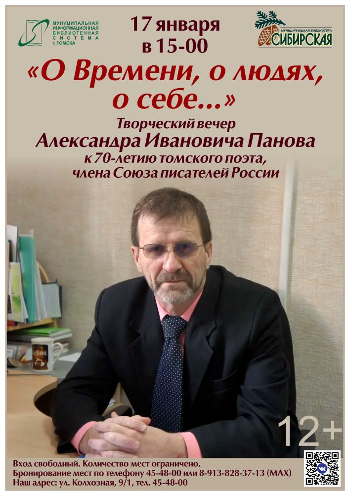 17 января в 15.00 в муниципальной библиотеке «Сибирская» (ул. Колхозная, 9/1) пройдёт юбилейный творческий вечер А. И. Панова «О Времени, о людях, о себе... ». Томский поэт, постоянный участник фестиваля «Чеховские пятницы» поделится лучшими страницами своего творчества, а друзья и коллеги автора выступят с концертными номерами.Встреча будет посвящена общественной и творческой деятельности А. И. Панова - участию в создании литературных сборников, организации поэтических встреч, участию в литературных объединениях «Автограф», «Экспромт», «Литературные четверги» и др. Автор прочитает стихотворения из сборников «Бесправие души», «За кругом круг», «Дыхание жизни» и др. Прозвучат произведения о малой родине А. И. Панова - городе Колпашево, о родителях, о природе, о людях. Юбиляр расскажет истории из жизни, ответит на вопросы зрителей. Также в программе вечера: выступления томских поэтов и прозаиков, солистов-вокалистов, солистов-инструменталистов, членов РОО «Союз томских композиторов». Вход свободный. Количество мест ограничено. Бронирование мест по телефону 45-48-00 в часы работы библиотеки: вторник – воскресенье с 9.00 до 20.00, или на страницах социальных сетей: Вконтакте, Telegram. Без предварительной записи посадочные места не гарантируются! 12.01.2026 г.